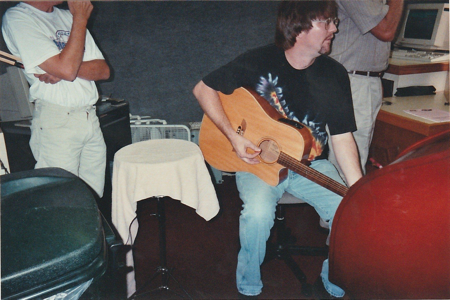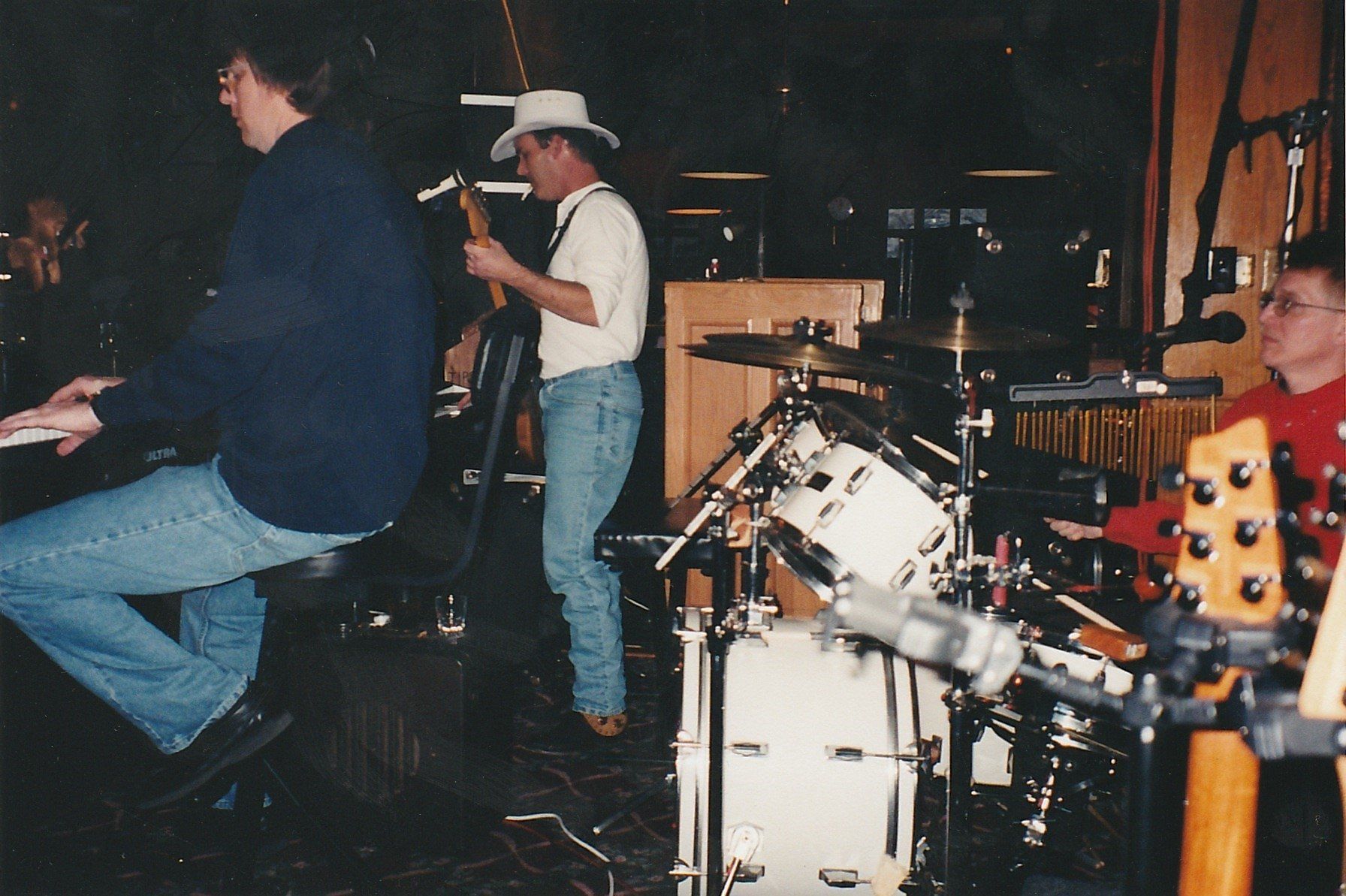 An unplugged gig at the Park Hotel lounge in Hot Springs. Gary Bell, Me, Damon Proppe L-R and Possum (a bouncer in Hot Springs then) sitting to the right.