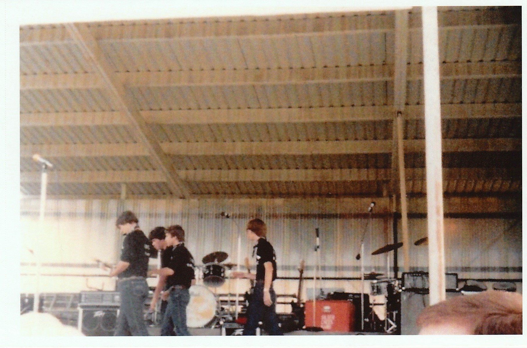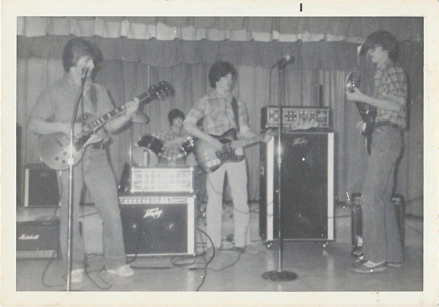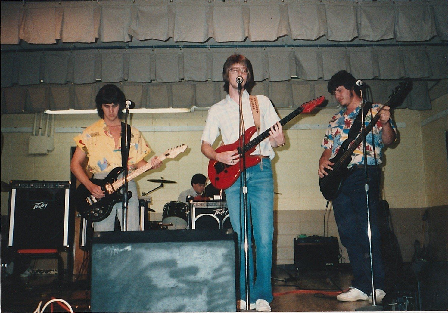Photo 2 of first gig at high school jamboree with 2 other bands in 1982. We opened the show. From left to right: Barry Walker, Keith Sirmon, Roy O'neal, Scott Arivett